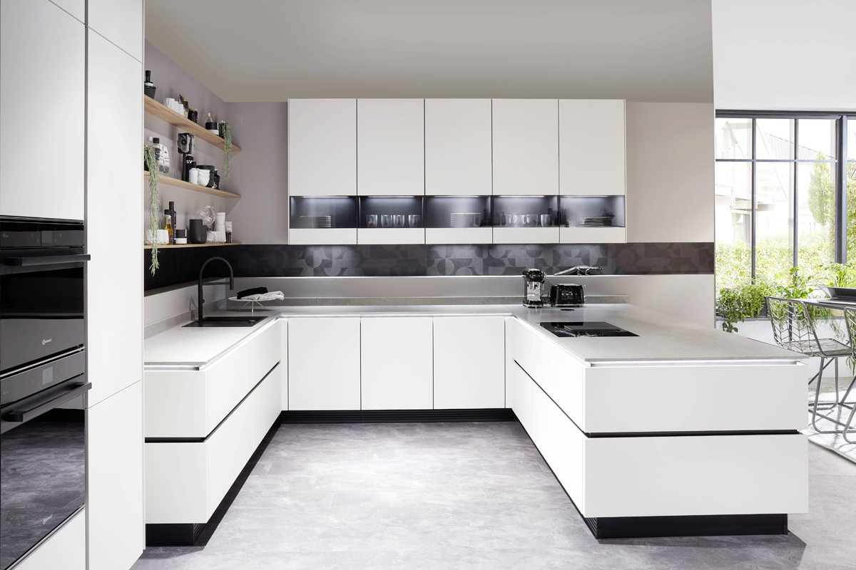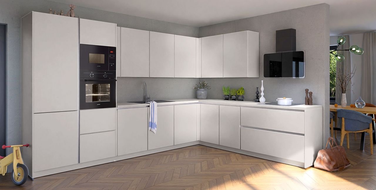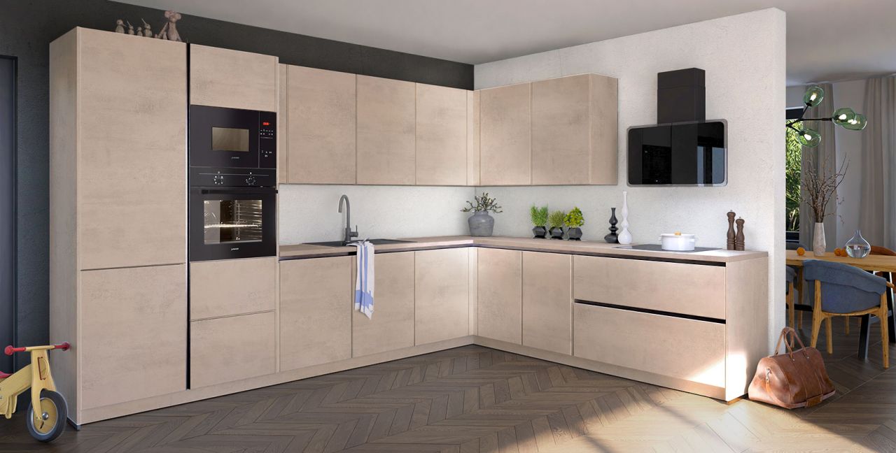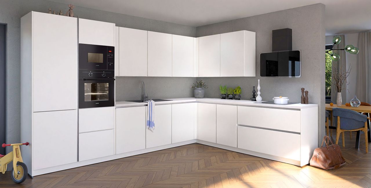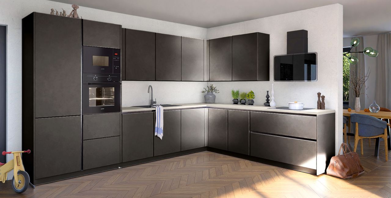 Inclusief inbouwoven zwart Junker JF1300061 Energieklasse A, keramische kookplaat Junker JR36DT54, afzuigunit RVS / glas Faber GLAM-FIT BK80 Energieklasse A, koelkast Laurus LKG88E Energieklasse E, magnetron Junker JP4119260, inbouw-designspoelbak Elleci Logik 300, XL-kasten, onderkast met uittrekinterieur.
